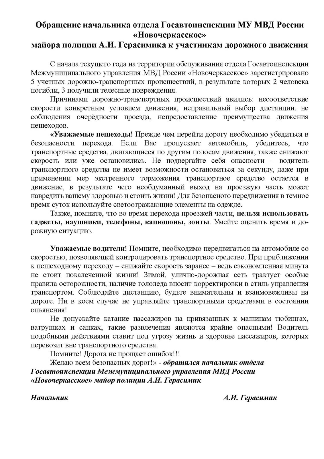 Предлагаем ознакомиться с письмом начальника отдела Госавтоинспекции МУ МВД России «Новочеркасское» майора полиции А.И. Герасимика к участникам дорожного движения.